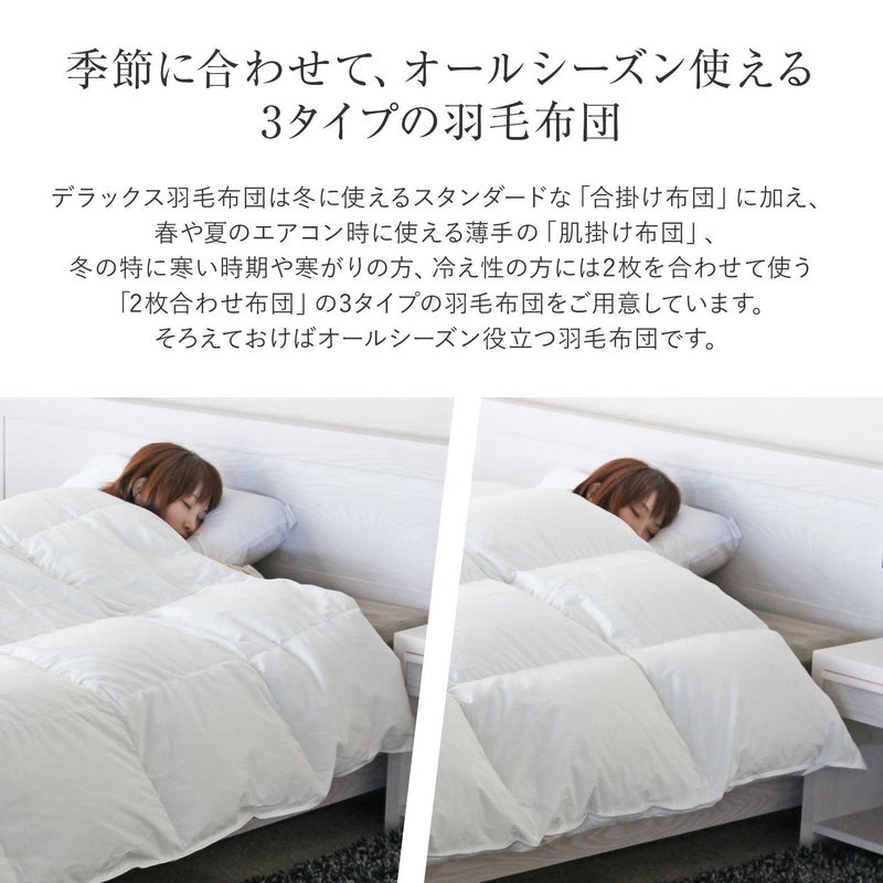軽くて温かい。貴重なマザーグースダウン93%、側生地にサテン生地を採用と、ワンランク上を目指した当店オリジナルの羽毛布団です。安心の日本製、品質も保証付き。暑い季節はこれ1枚で、寒い季節は同シリーズの合掛け羽毛布団と「2枚合わせ」でのご使用がオススメ!