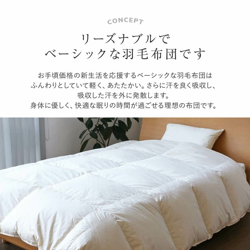 お手頃価格のベーシック羽毛布団。軽くて保温性・通気性も抜群です!別売りの「羽毛肌掛け布団」と重ねて、「ペアタイプ」としてお使いいただくことをオススメします。
