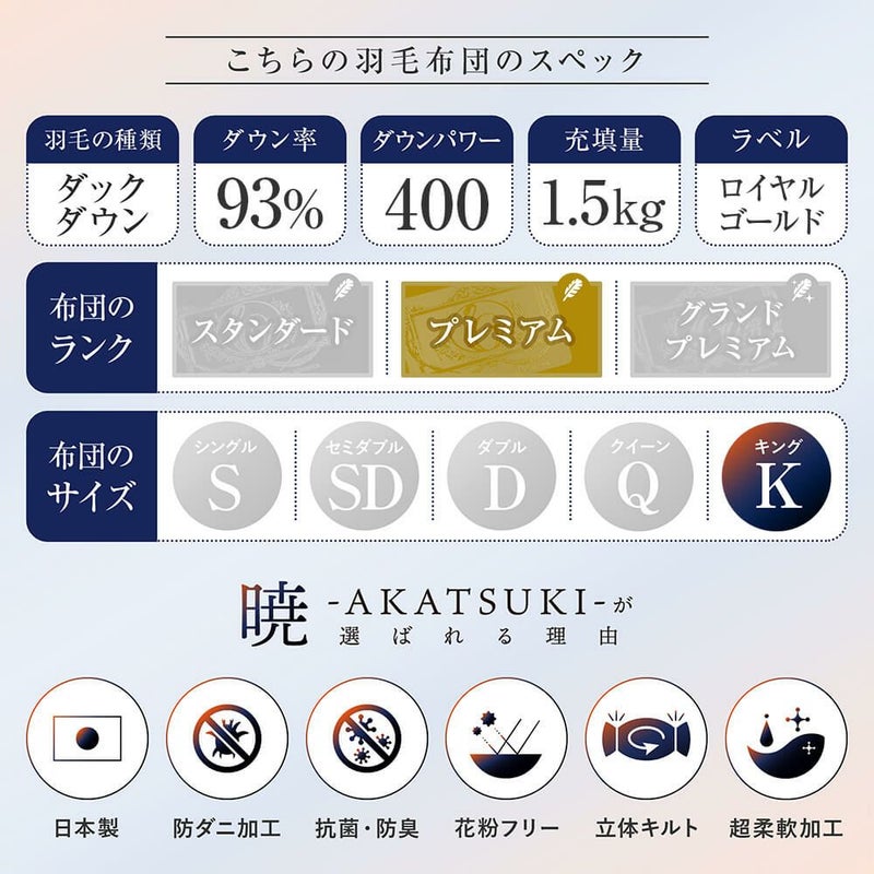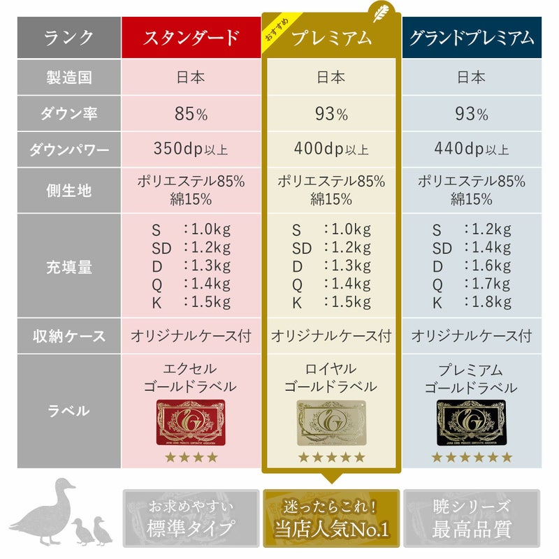 日本羽毛製品協同組合が定める「ロイヤルゴールドラベル」を取得した、当店オリジナルの国産合掛け羽毛布団です。防臭、抗菌加工を施しており、安心安全にご使用いただけます。