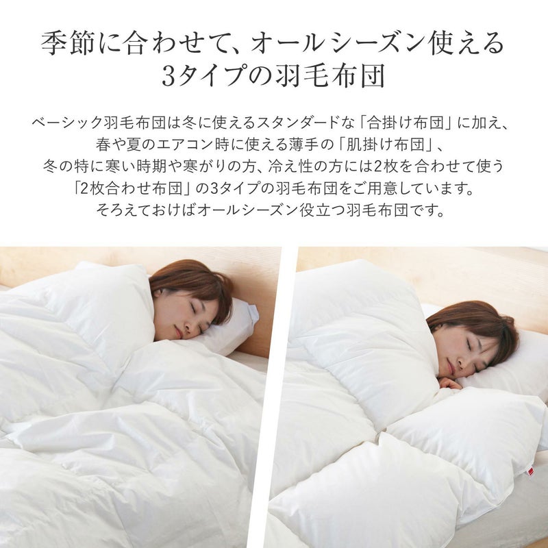 軽くて温かい。羽毛布団の良さをシンプルに実感でき、お値段もお手頃にと出来上がった当店オリジナルの羽毛布団です。安心の日本製、品質も保証付き。暑い季節はこれ1枚で、寒い季節は同シリーズの合掛け羽毛布団と合わせて「2枚合わせ」でのご使用がオススメ!