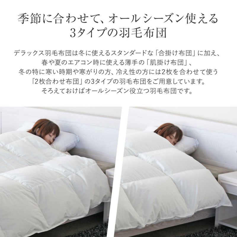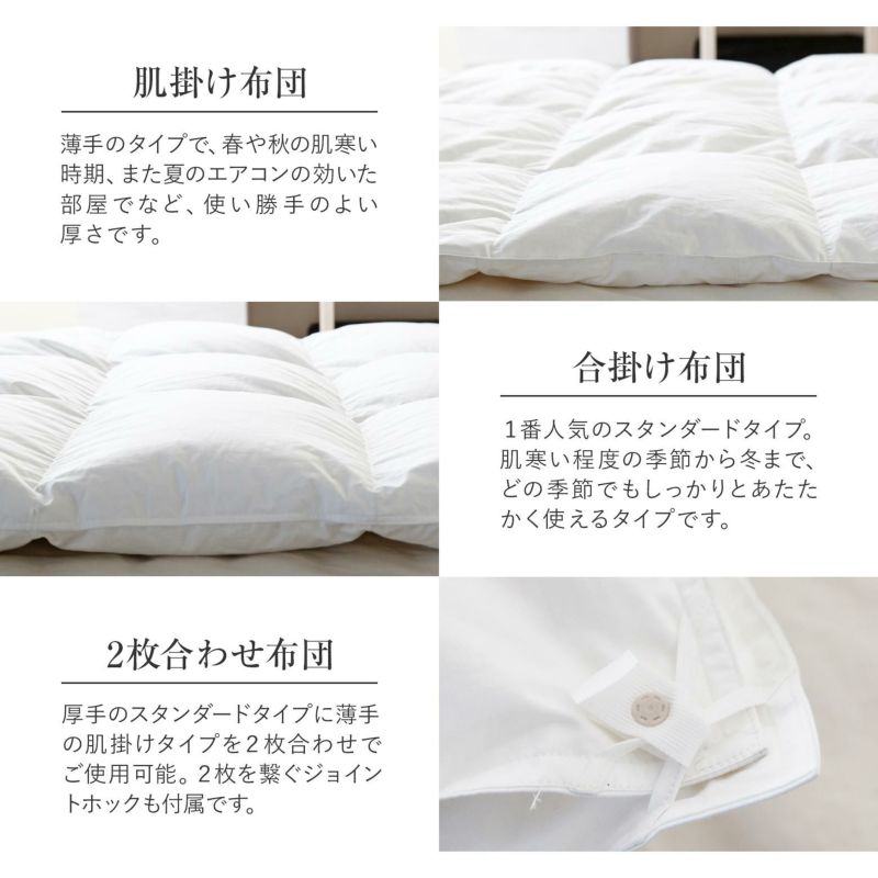 軽くて温かい。貴重なマザーグースダウン93%、側生地にサテン生地を採用と、ワンランク上を目指した当店オリジナルの羽毛布団です。安心の日本製、品質も保証付き。同シリーズの肌掛け羽毛布団と「2枚合わせ」でのご使用もオススメ!