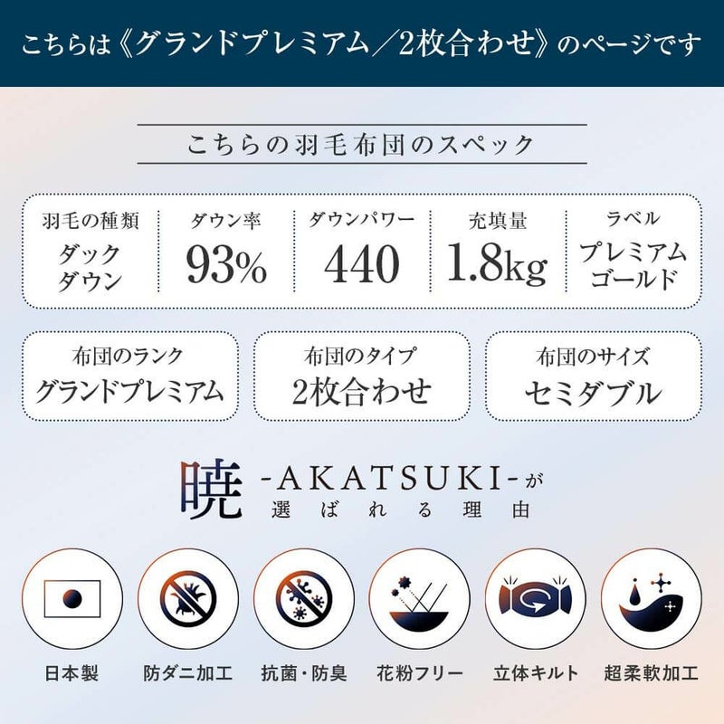 暁-AKATSUKI- グランドプレミアム2枚合わせ羽毛布団 170 x 210cm