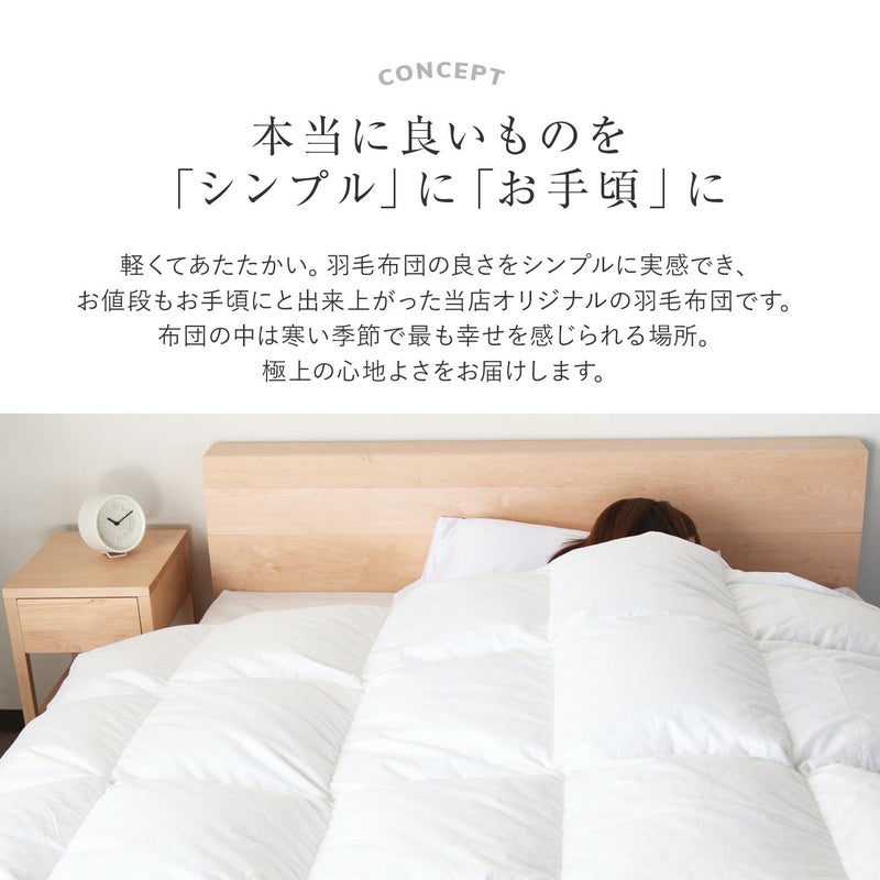 軽くて温かい。羽毛布団の良さをシンプルに実感でき、お値段もお手頃にと出来上がった当店オリジナルの羽毛布団です。肌掛け+合掛けの2枚合わせなので、一年中、季節に応じて使い分けできます。安心の日本製、品質も保証付き。