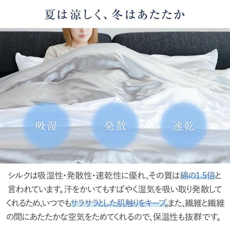 シルク100%のカバーリングです。とろけるような肌ざわりで、敏感肌の方や赤ちゃんにもお勧めです。夏は涼しく冬は暖かい、高級感のある寝具です。