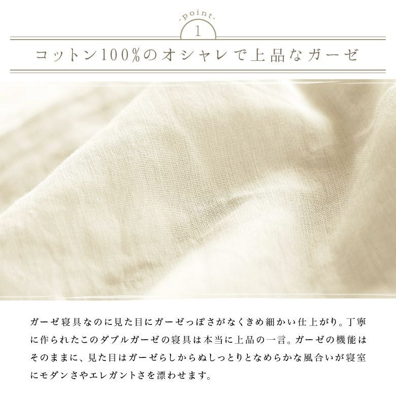 一年中快適な綿100%のダブルガーゼのベッドリネンです。ふんわりやさしい肌ざわりの2重ガーゼ 吸水性が よく 夏はサラリと涼感を演出また2重織り組織が体温を保ち冬も快適一年を通してオススメの素材です。ヨコ糸には細番手60番コーマ糸を使用より豊かな風合いになりました。
