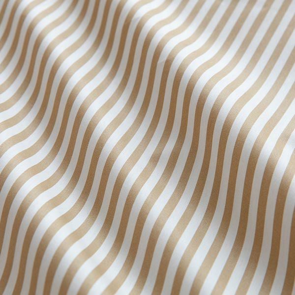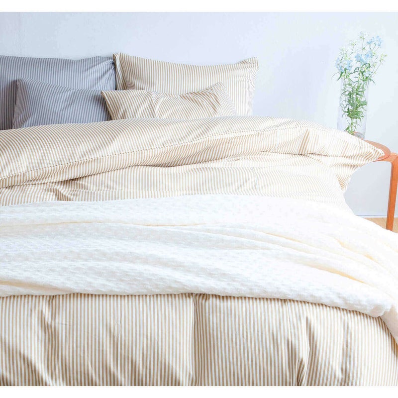 サテン織のしなやかな生地に、コントラストを抑えた上品な配色のストライプ。国内工場で丁寧にプリントすることで、より艶やかに輝きを放つファブリックに仕上がりました。5ミリの等間隔で、規則正しく配置されたストライプは、すっきりと整った清潔な印象を与えてくれます。ベージュ×グレイ ブルー×グレイと、コーディネートの対比も楽しいカラーバリエーションです。バーチカル・ストライプ stripe 縞(しま) サテンストライプ トラッド  コンフォーターカバー