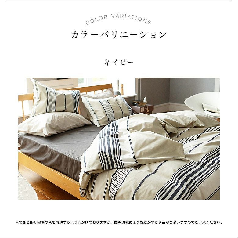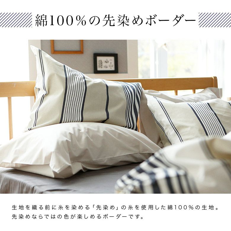 古き良きティッキングストライプのような、使い込むほどに愛着の増すボーダーです。落ち着いた色味のため、どのようなお部屋にも馴染む寝具です。
