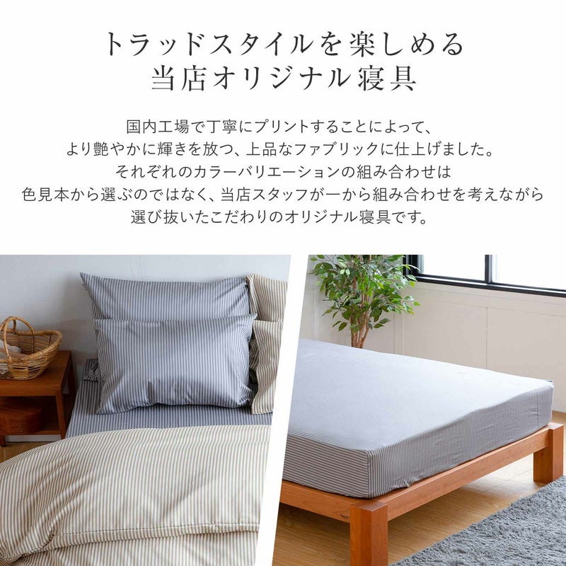 サテン織のしなやかな生地に、コントラストを抑えた上品な配色のストライプ。国内工場で丁寧にプリントすることで、より艶やかに輝きを放つファブリックに仕上がりました。5ミリの細く、規則正しく配置されたストライプは、すっきりと整った清潔な印象を与えてくれます。ベージュ×グレイ ブルー×グレイと、コーディネートの対比も楽しいカラーバリエーションです。バーチカル・ストライプ stripe 縞(しま) サテンストライプ トラッド