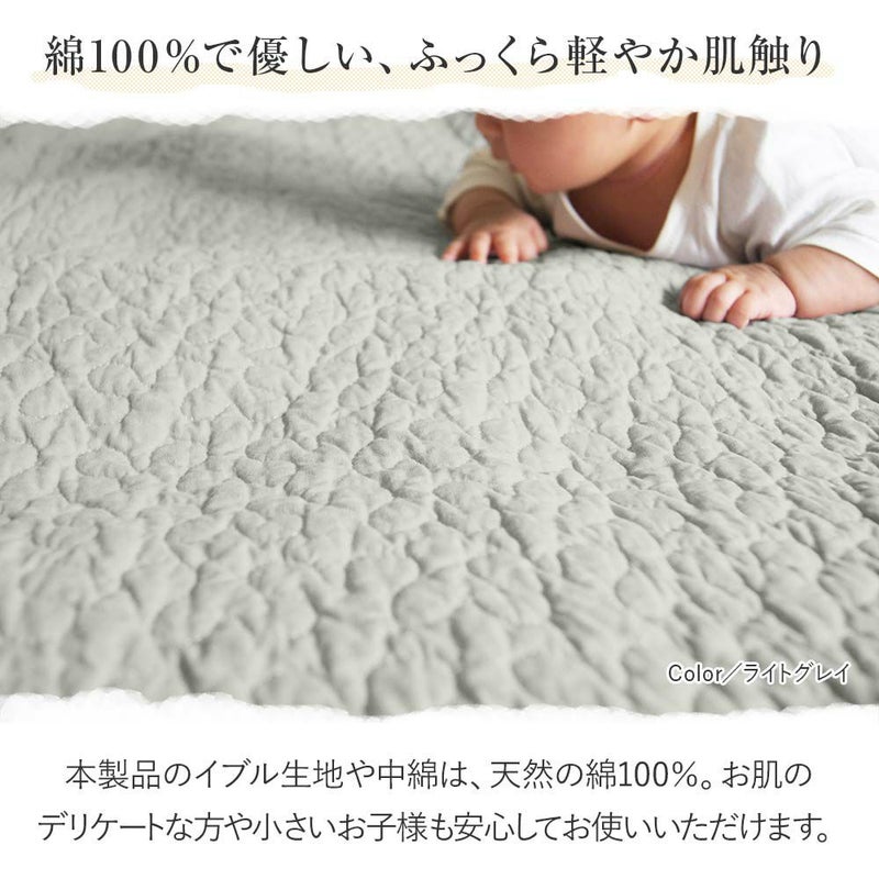 韓国インテリアでお馴染みの生地「イブル」。デコボコしたキルティングを施しているので立体感と心地よさが魅力。本製品のイブル生地や中綿は、コットン100%だから赤ちゃんにも優しい素材でできています。使い込むほどにふんわりと柔らか。夏はサラっと、冬はあたたかく、1年中快適にお使いいただけます。