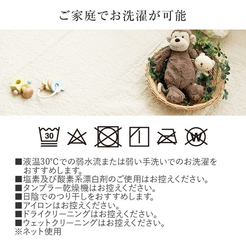 韓国インテリアでお馴染みの生地「イブル」。デコボコしたキルティングを施しているので立体感と心地よさが魅力。本製品のイブル生地や中綿は、コットン100%だから赤ちゃんにも優しい素材でできています。使い込むほどにふんわりと柔らか。夏はサラっと、冬はあたたかく、1年中快適にお使いいただけます。