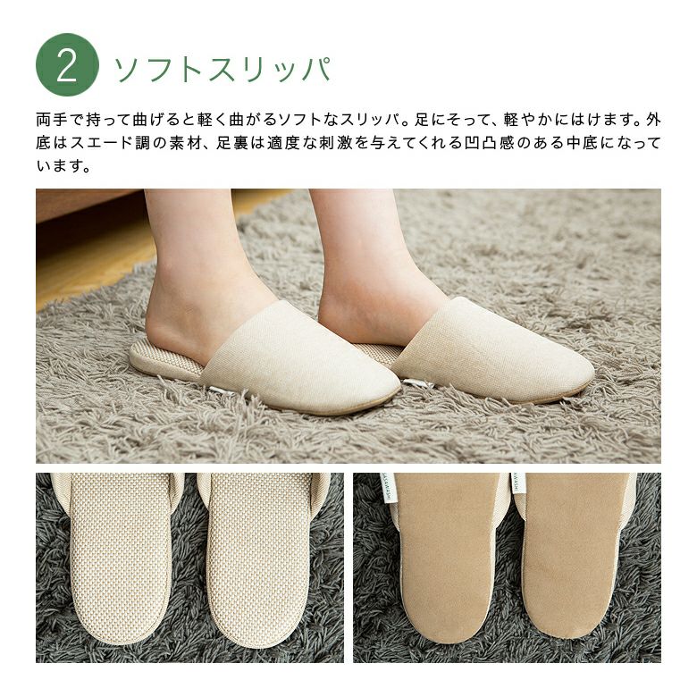 一日のはじまりは、目覚めのいい朝から。起きてすぐに履くルームシューズがささ和紙でできていたなら、素足も喜んでいるようです。