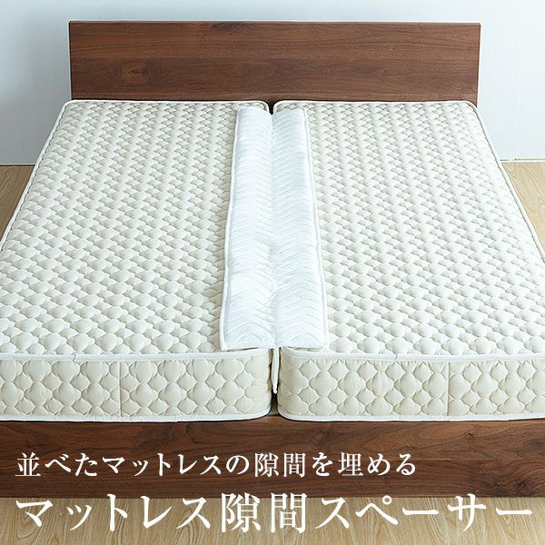 クイーンサイズ・キングサイズ2枚仕様、またマットレスを2枚並べて連結したい場合に隙間を埋め、繋ぎ目を解消する隙間スペーサー(隙間パッド)です。伸縮性のあるニット生地とウレタンがマットレスの枠線の違和感解消します。2枚のマットレスの連結に、この隙間スペーサーを取り付け、その上に ベッドパッド、さらにボックスシーツを取り付けてご使用ください。