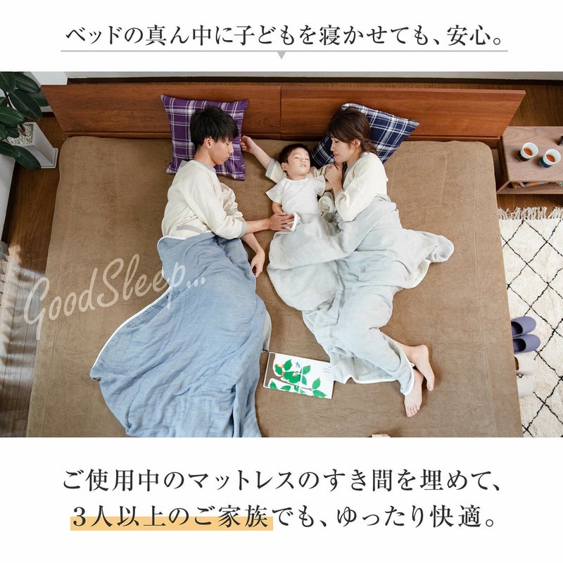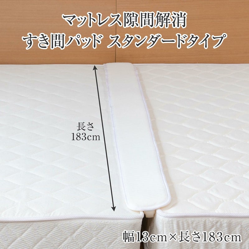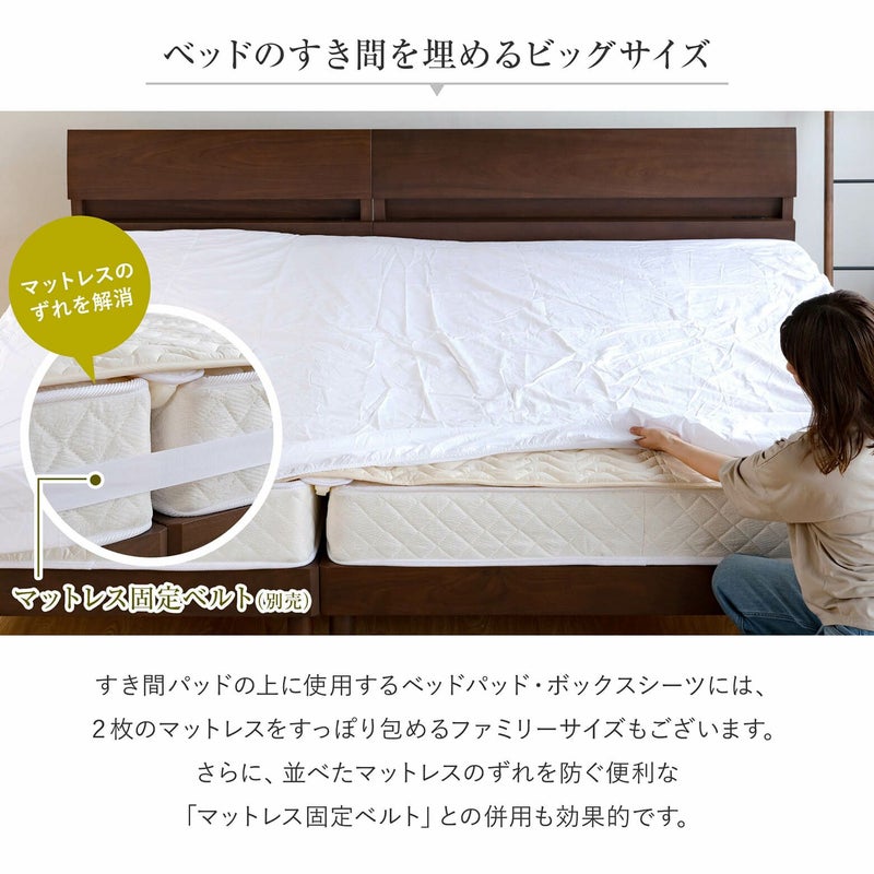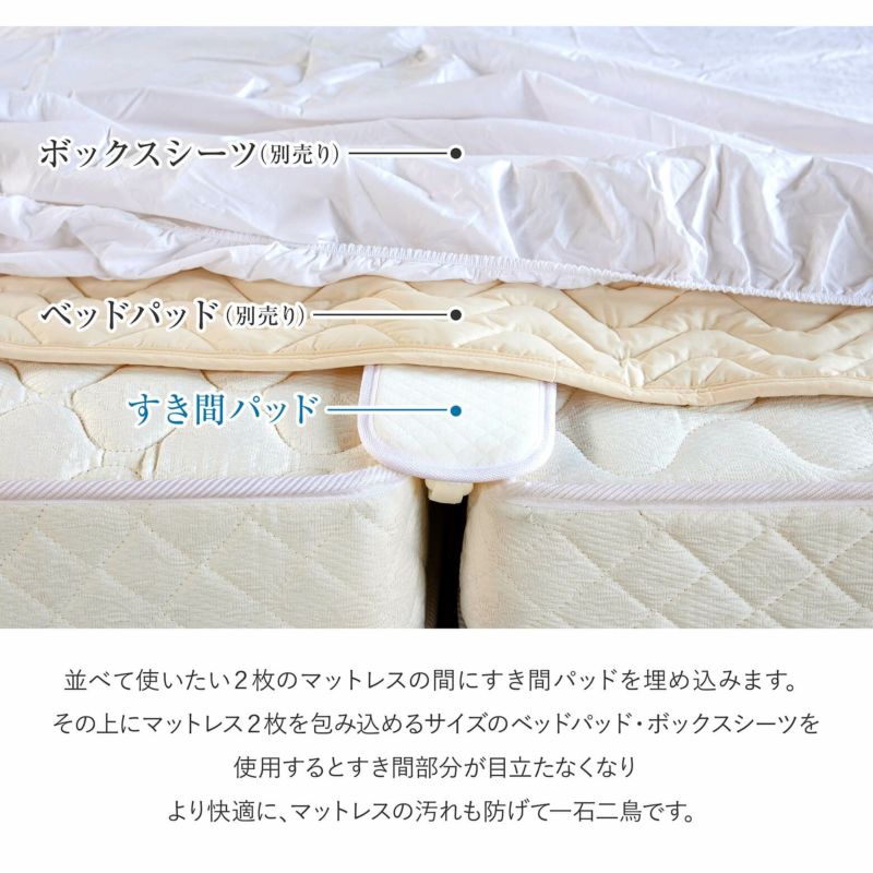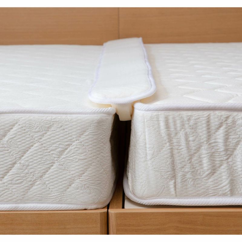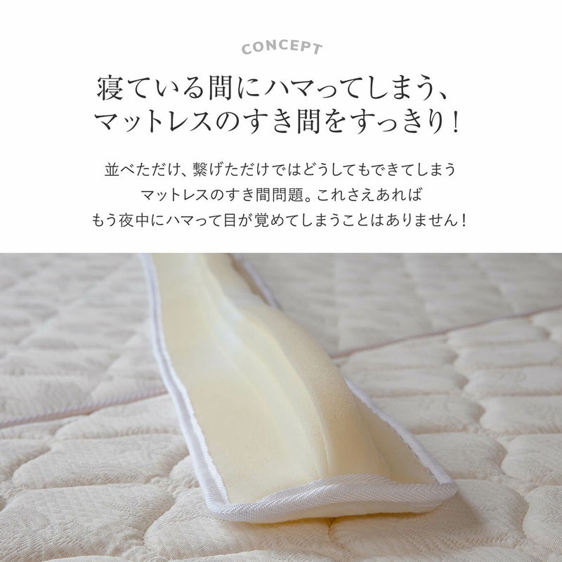クイーンサイズ・キングサイズ2枚仕様、またマットレスを2枚並べて連結したい場合に隙間を埋め、繋ぎ目を解消する隙間スペーサー(隙間パッド)です。伸縮性のあるウレタンがマットレスの枠線の違和感解消します。2枚のマットレスの連結に、この隙間スペーサーを取り付け、その上に ベッドパッド、さらにボックスシーツを取り付けてご使用ください。