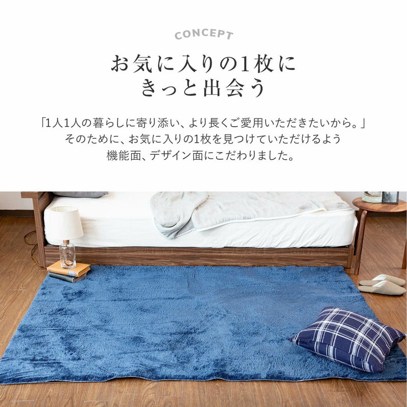 シャギー調の毛足でさらさらとした肌触りが特長の、ふわふわ気持ち良いモダンなラグです。丸洗いできるので、遠慮なく使えるのも嬉しいポイント。裏面は滑り止めを施しているので歩いてもズレにくく、フローリングでも安心してご使用いただけます。軽量でコンパクトにたためるので、お掃除や模様替えも簡単です。