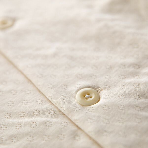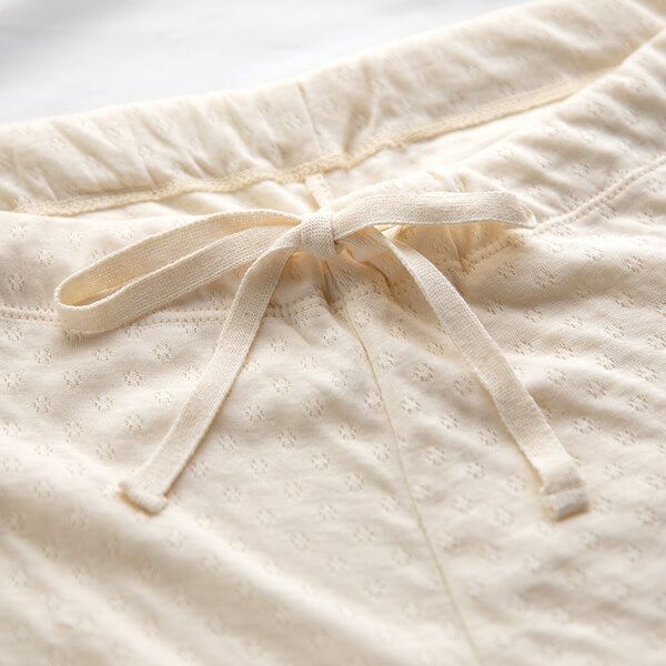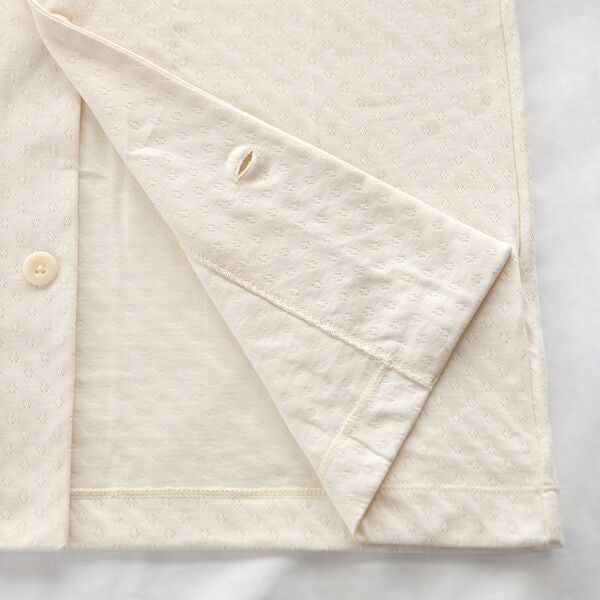 空気を含んであたたかい、エアニット生地を使用したシンプルな開襟パジャマ。首元が寒いときは襟元のボタンで上まで閉じることができます。オーガニックコットンそのものの気持ちよさを感じられるアイテムです。