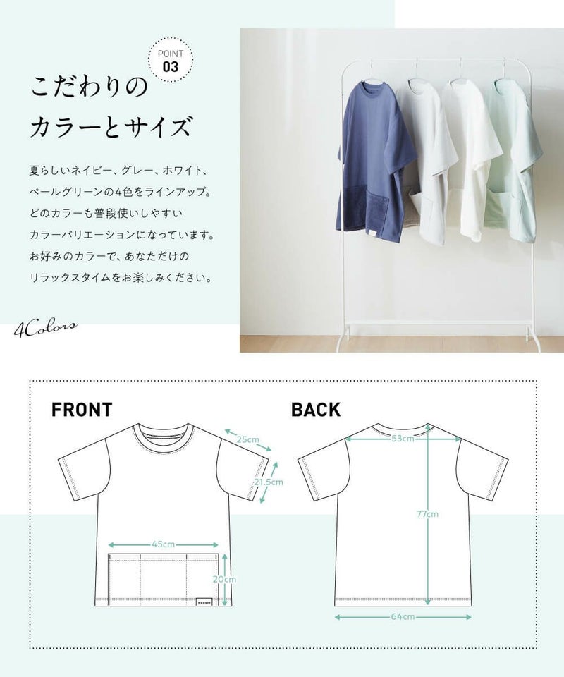パイルとガーゼの特殊な2重織りの柔らかくて吸水性に優れたタオル素材のルームウェアです。暑い季節もサラッと快適な着心地です。