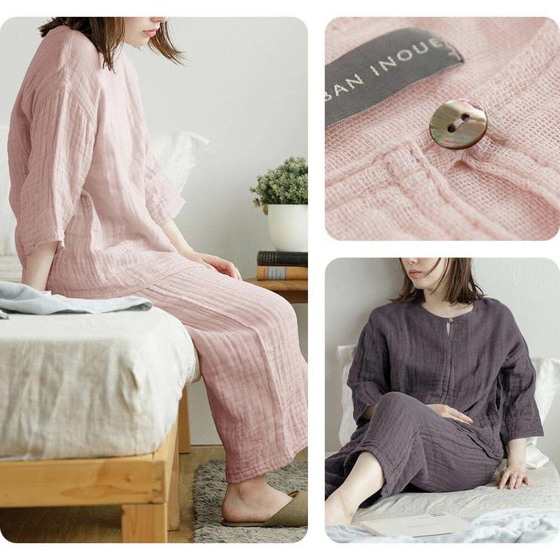 かやパジャマは上下セットで、夏はしっかりと寝汗を吸収し、肌にまとわりつく事がありません。冬はインナーや上着を重ねる事で保温性を発揮します。シンプルなデザインなので上下それぞれ単品として、普段着としてもお使いいただけます。