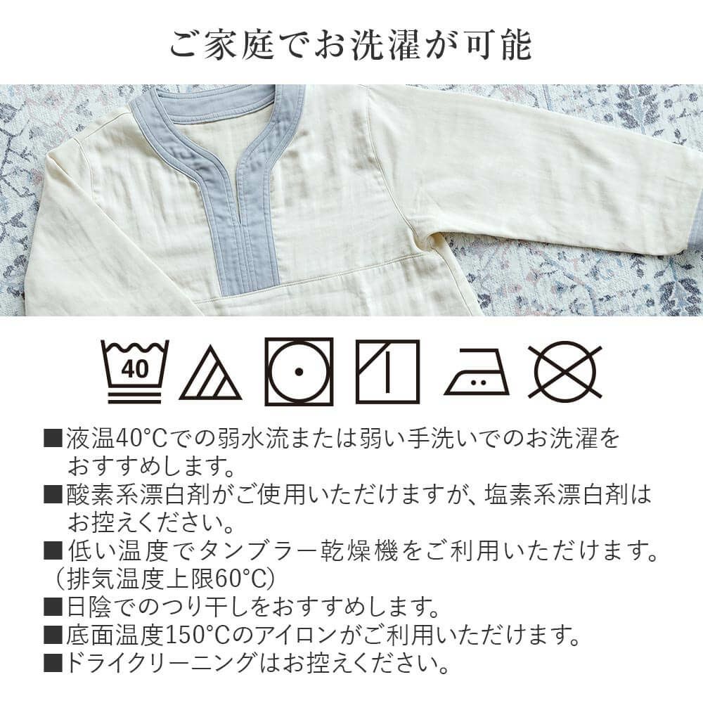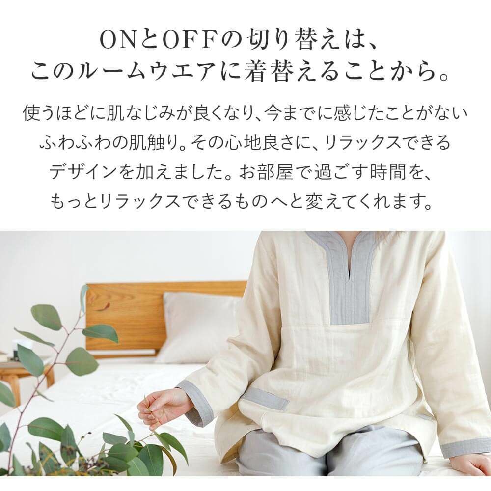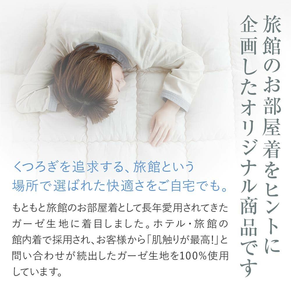 着ているだけで、気持ちまでリラックス。眠る時だけでなく、自宅に帰ったら、まずはこのルームウエアに着替えましょう。吸湿性・発散性・保温性に優れ、肌触りも心地よい、ガーゼ素材はパジャマに最適!表面はヘリンボーン織りを採用することで、人前に出ても恥ずかしくない、きれいな印象を保っています。この生地はホテル・旅館の館内着として愛用されており、あまりの心地よさに自宅用に買い求める方が続出!生地の心地よさと、ボタンのないゆったりとしたデザインにこだわった、当店オリジナルルームウエアです。