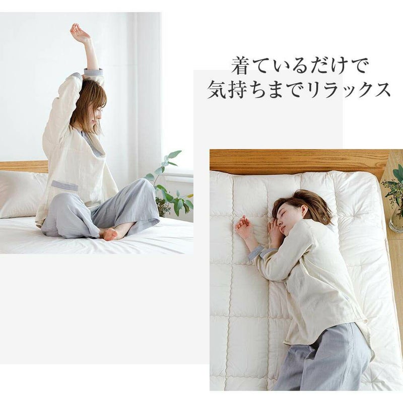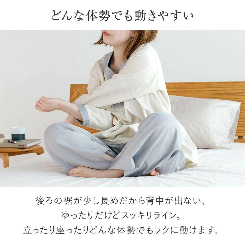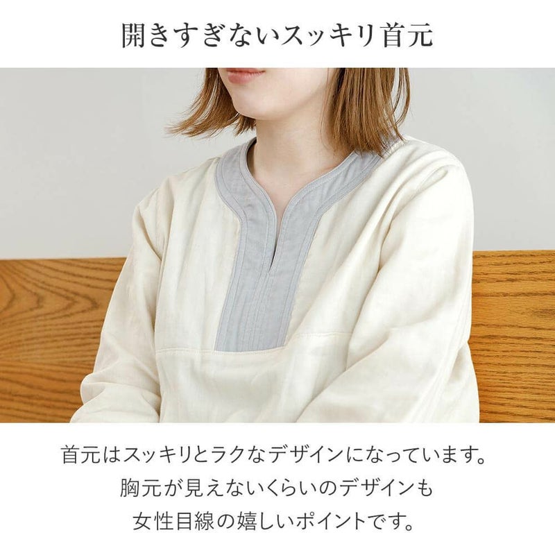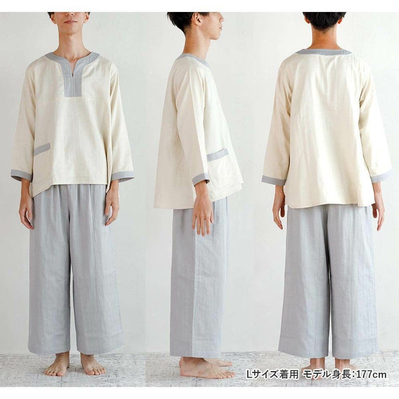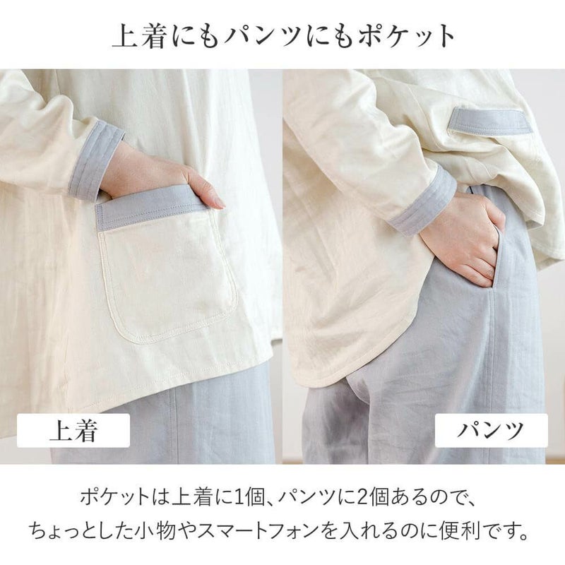 着ているだけで、気持ちまでリラックス。眠る時だけでなく、自宅に帰ったら、まずはこのルームウエアに着替えましょう。吸湿性・発散性・保温性に優れ、肌触りも心地よい、ガーゼ素材はパジャマに最適!表面はヘリンボーン織りを採用することで、人前に出ても恥ずかしくない、きれいな印象を保っています。この生地はホテル・旅館の館内着として愛用されており、あまりの心地よさに自宅用に買い求める方が続出!生地の心地よさと、ボタンのないゆったりとしたデザインにこだわった、当店オリジナルルームウエアです。