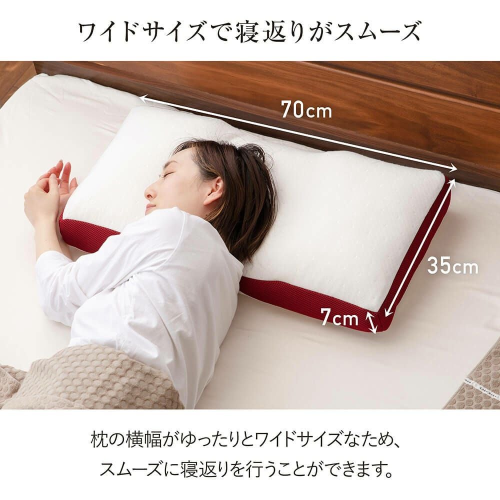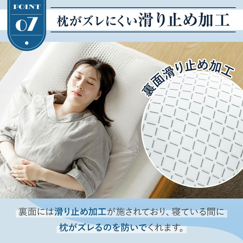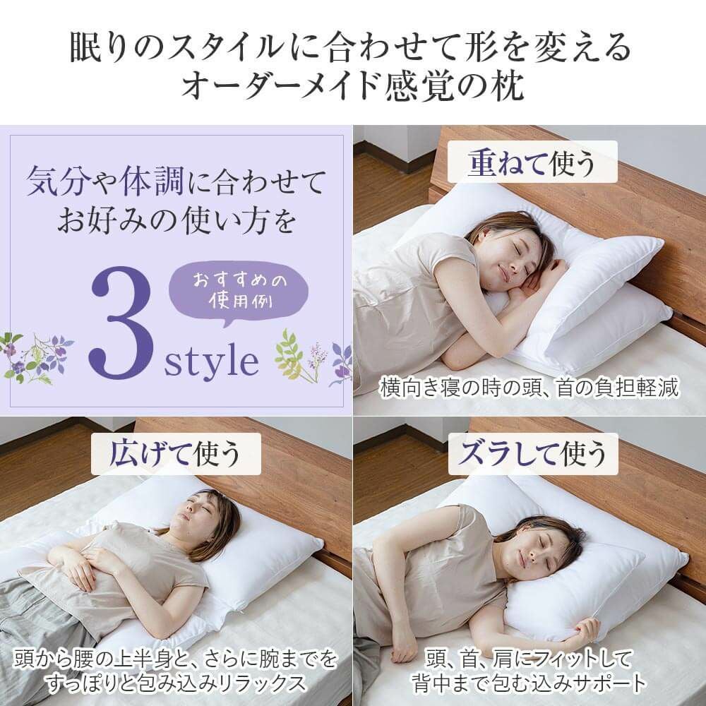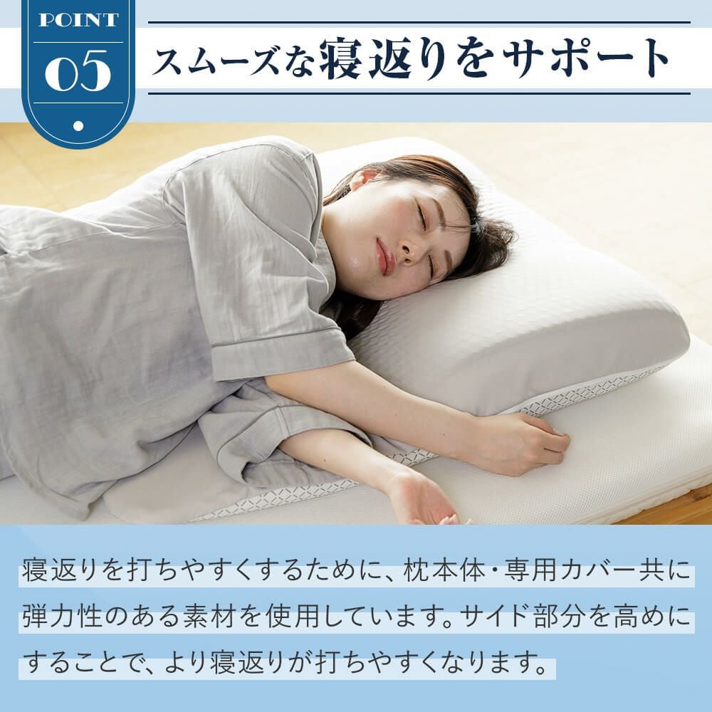 枕の正しい使用位置は「枕に頭を乗せ、肩口があたる」くらいの位置です。後頭部から首筋にかけての全体で頭部を支え、首のこりや肩こりを軽減します。枕に肩を乗せてしまうとかえって体に負担がかかります。画像のように、肩と枕がしっかり触れるように当てて眠るのがベストです。
