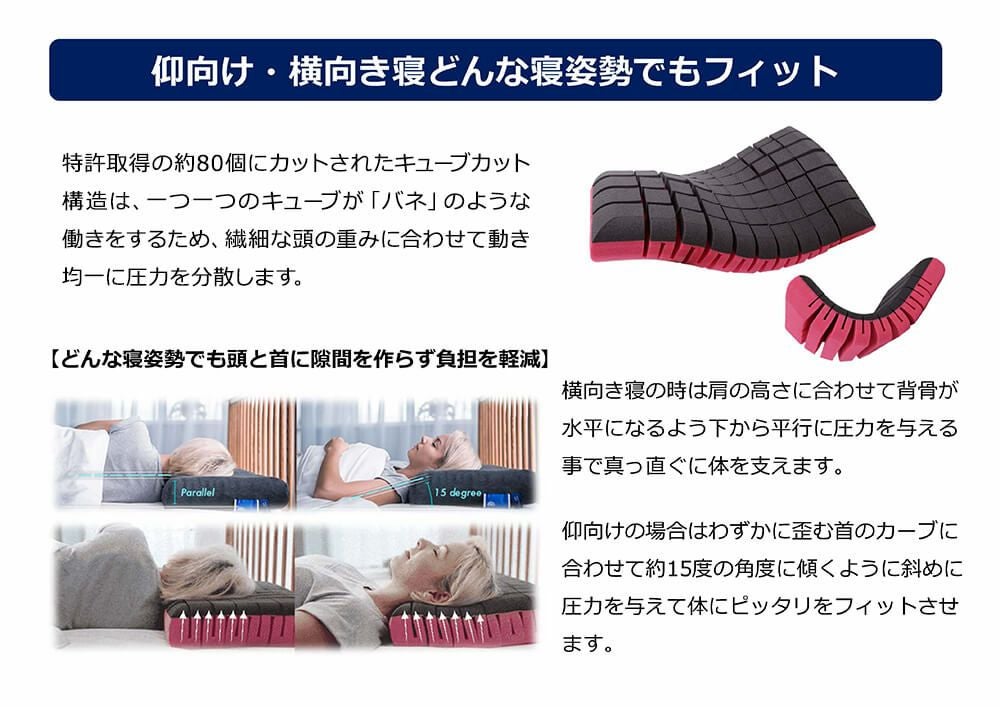 枕を首のカーブにフィットさせ、首とマットレスの間に生まれる隙間を埋めるのが正しい枕の使い方です。頭部の重みを広い範囲で分散させるためです。これを「頭圧分散」とも言い、頭の重量を全体に分散させることで楽に眠れるようになるのです。横向きの場合は頚椎が床と平行になるようにするのがポイントです。