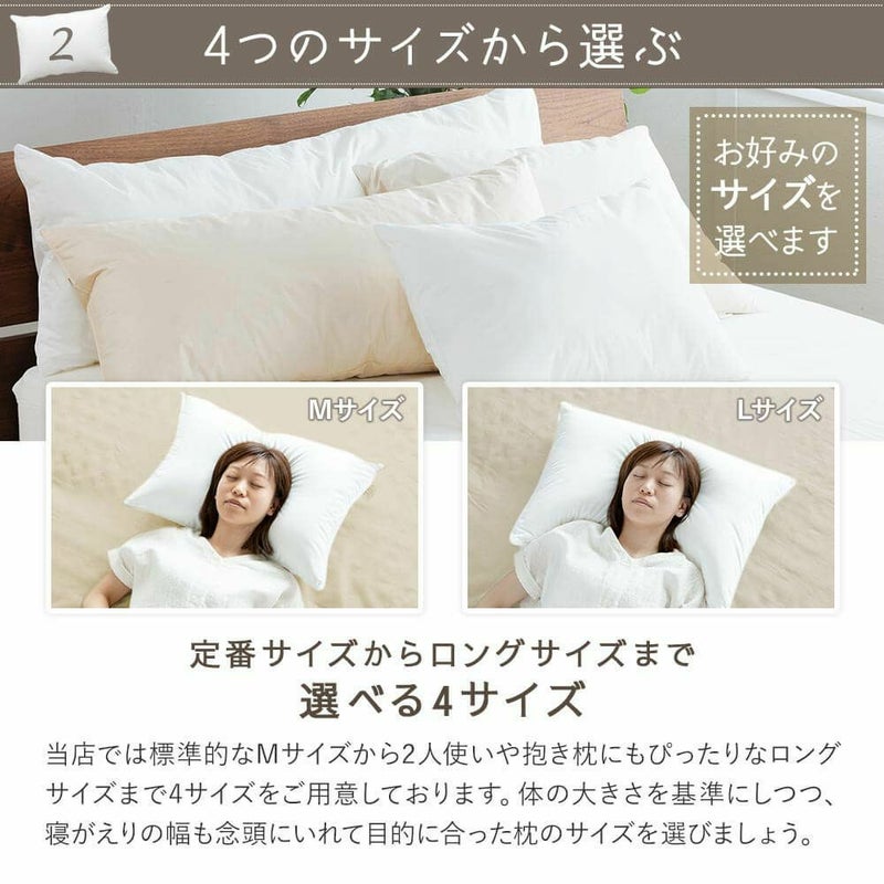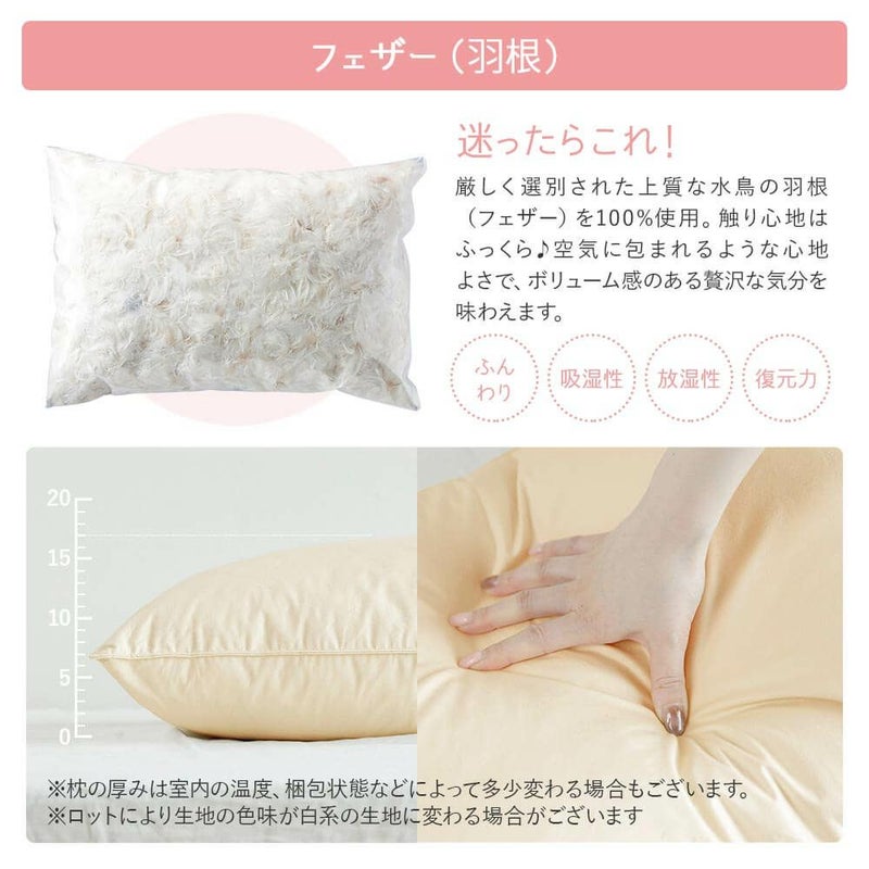 水鳥の羽根(フェザー)を100%使用したボリュームたっぷりの羽根枕。フェザーの弾力性が首をしっかり支えてくれます。