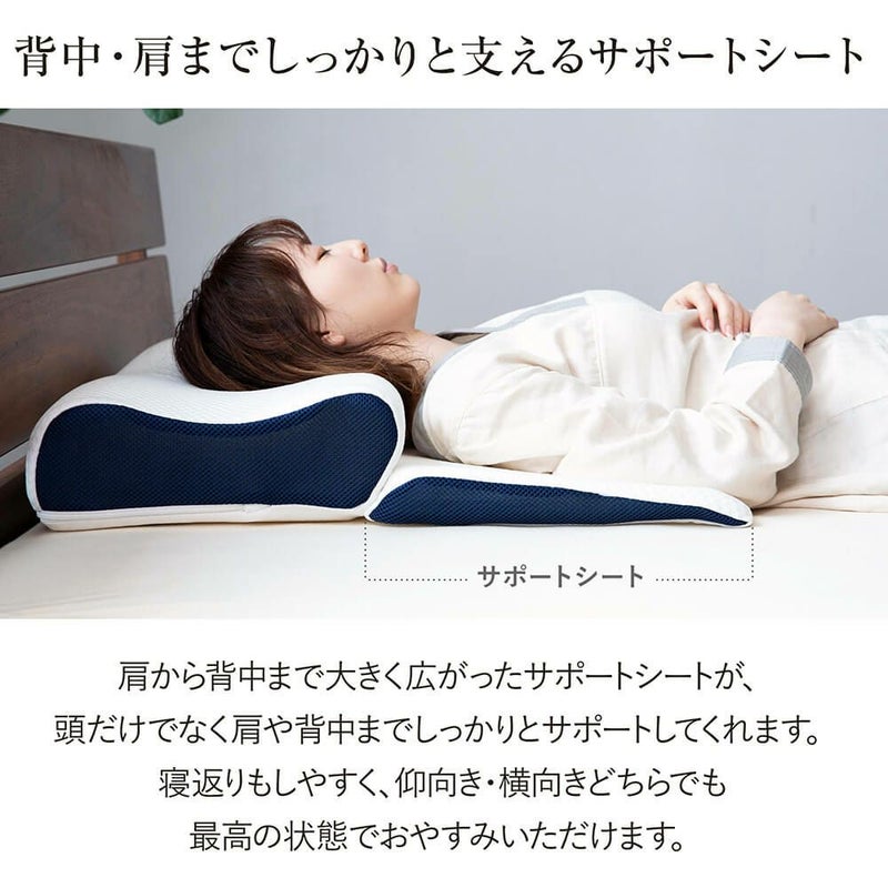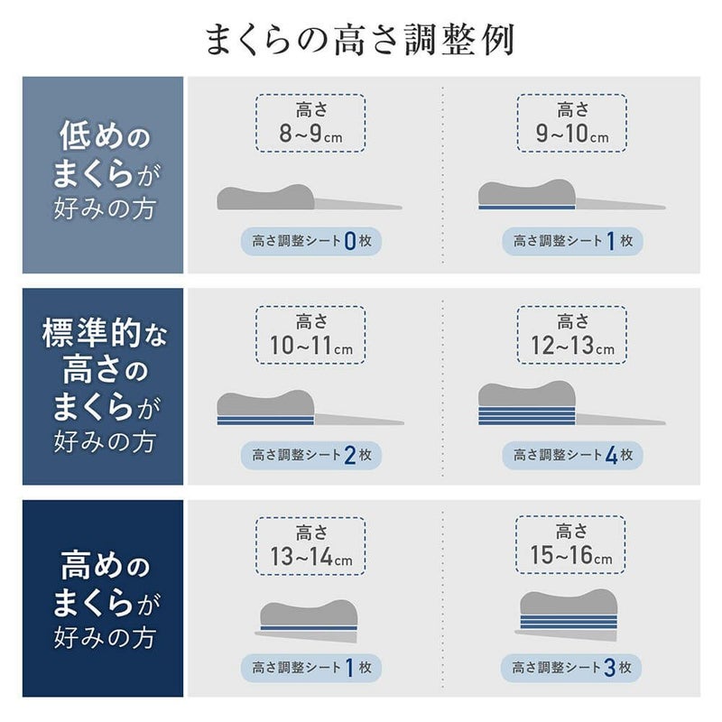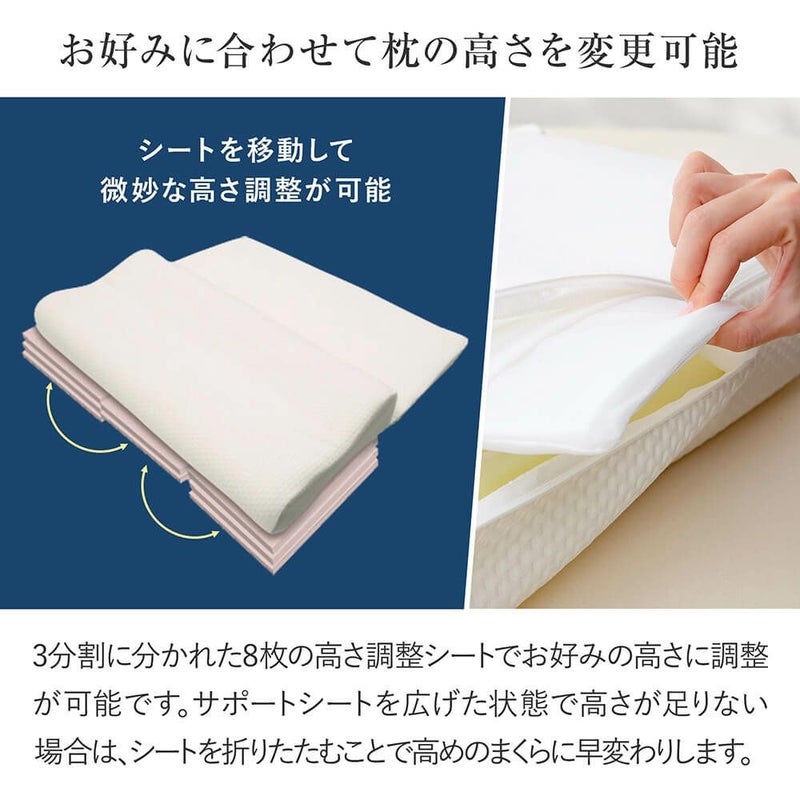 頭・首・背中まで上半身を包み込み、横向き寝、仰向き寝と様々な寝姿勢に対応。上半身全体を枕が支えることで、首や肩に集中しがちな負担を軽減します。高反発タイプはボヨンと跳ね返してしっかりと支えてくれます。3分割に分かれた厚み約1cmの高さ調整シートが計8枚付属しており、セミオーダー感覚でご自身に合った枕へ。箱入りなので、ギフトにもお勧めです。