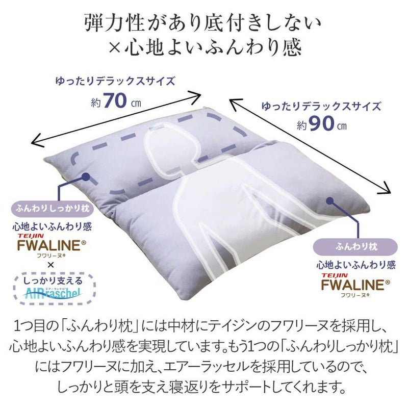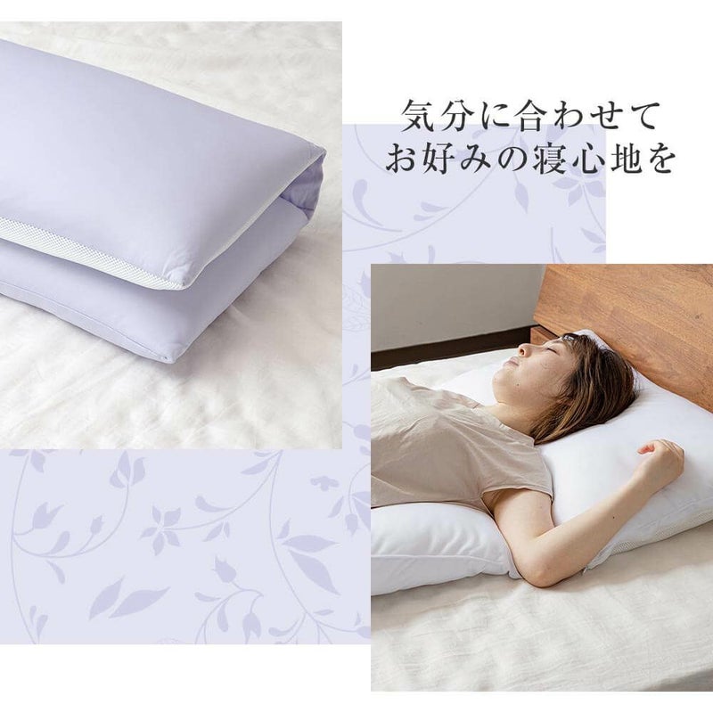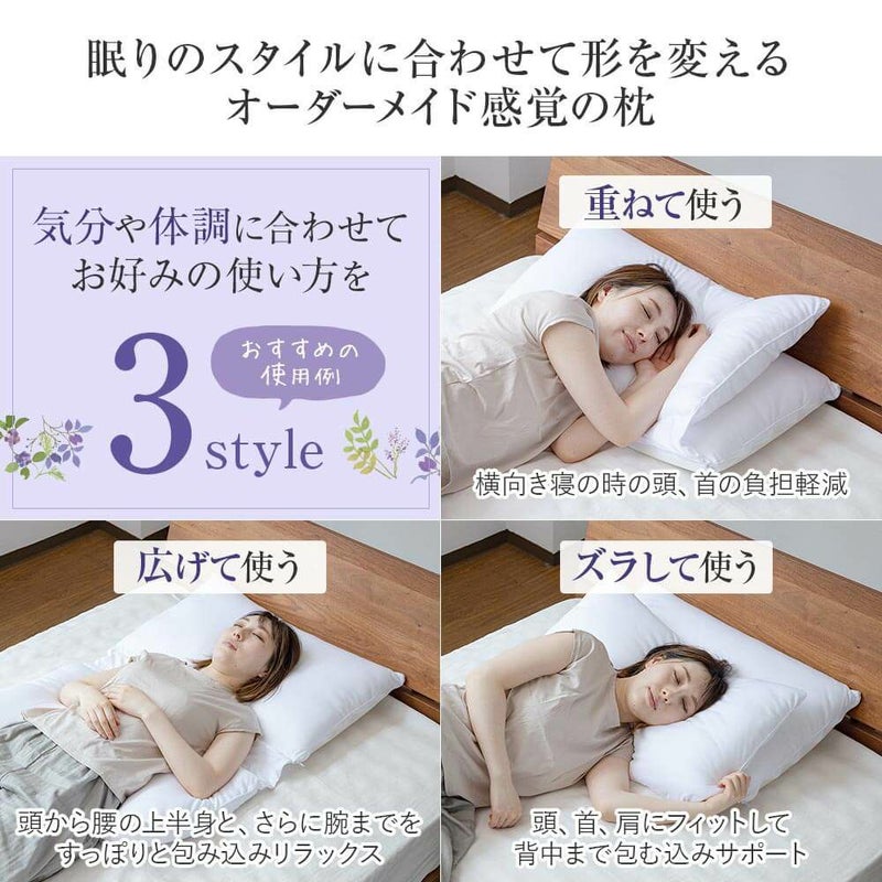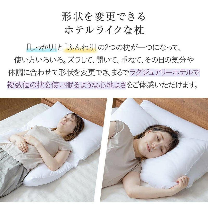 「しっかり」と「ふんわり」の2つの枕が一つになって、使い方いろいろ。ズラして、開いて、重ねて、その日の気分や体調に合わせて形状を変更でき、まるでラグジュアリーホテルで複数個の枕を使い眠るような心地よさをご体感いただけます。