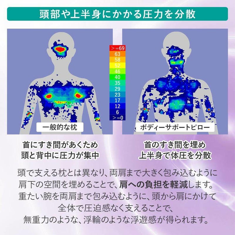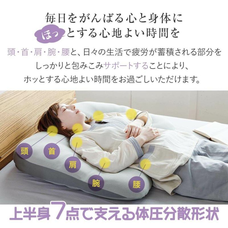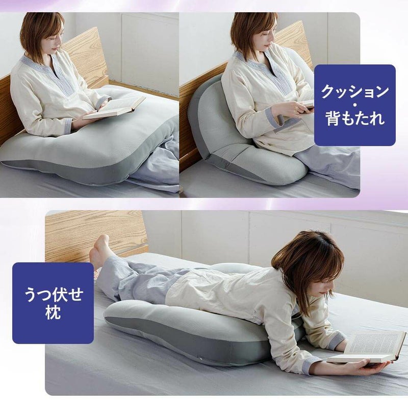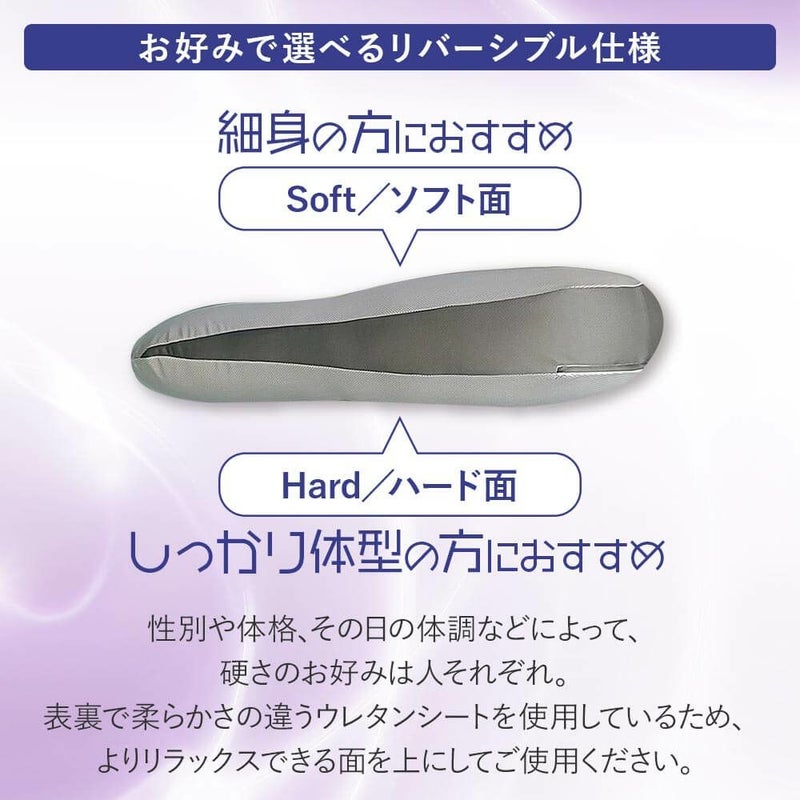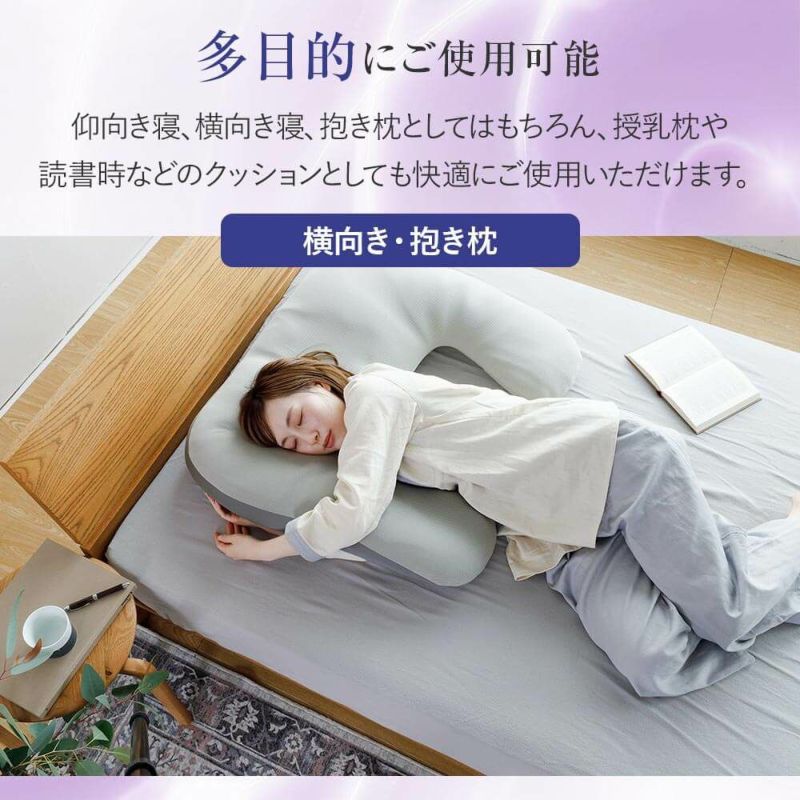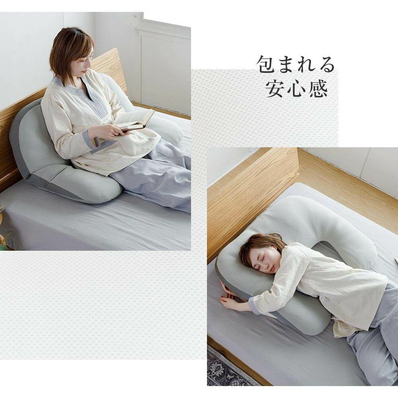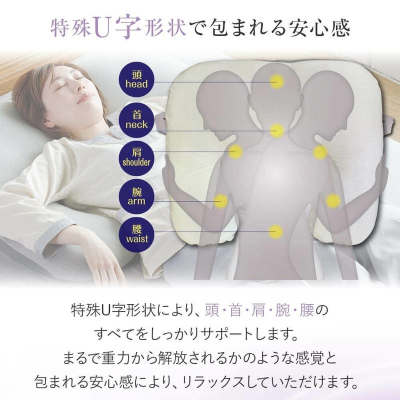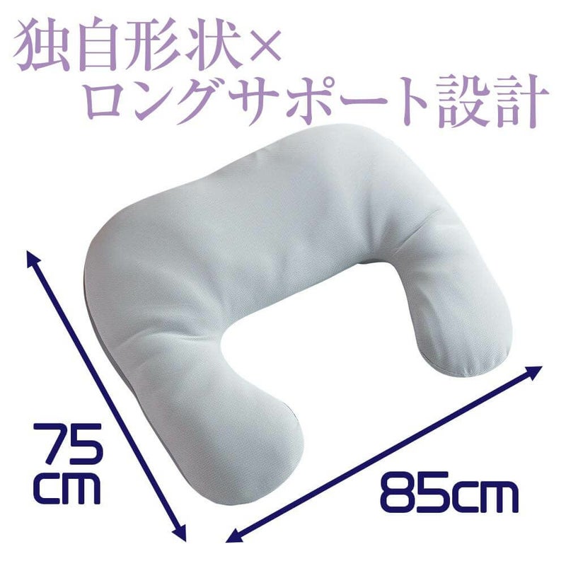 表裏で柔らかさの違うウレタンシートを使用しているため、お好みの硬さでご使用いただけます。特殊U字型形状により、頭・首・肩・腕をしっかりとサポート。仰向き、寝返り、横向き、抱き枕、授乳枕 等々、多目的にご利用いただけます。