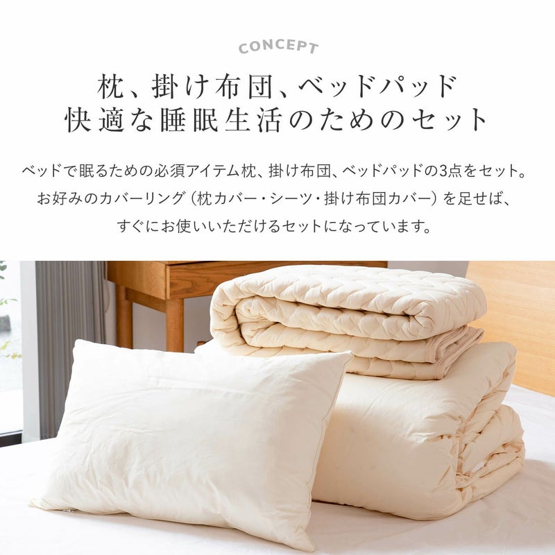 ベッドで眠るための必須アイテム「枕」「ベッドパッド」「掛け布団」の3点をセットにしました!