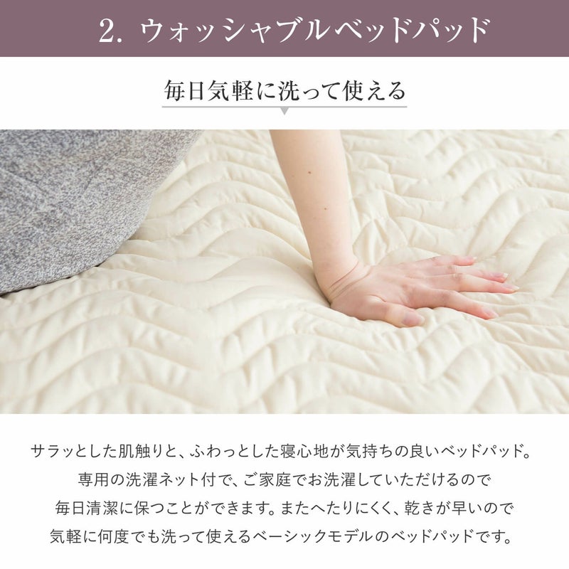 ベッドパッドはサラッとした肌触りと、ふわっとした寝心地がたまらなく気持ちよいと大人気の「ウォッシャブルベッドパッド」。へたりにくく乾きが早いので、お洗濯も楽々!専用の洗濯ネットが付いるのも嬉しいポイントです。抗菌・防臭綿を使用しています。