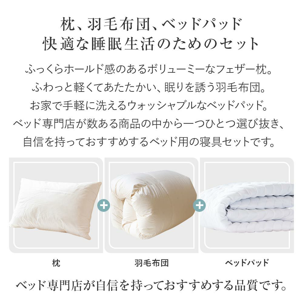 ふっくらホールド感のある「枕」。お家で丸洗いOKの「ベッドパッド」。ふわっと軽くてあたたかい「掛け布団」。ベッド専門店がおすすめする寝具セットです。