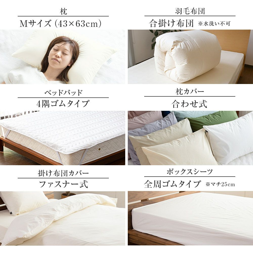 「枕」「枕カバー」「ボックスシーツ」「ベッドパッド」「掛け布団」「掛け布団カバー」の6点がセットになっていて、届いたその日から、ぐっすり快眠できます。