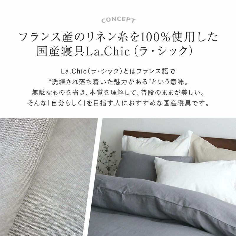 La.Chic(ラシック)とはフランス語で“洗練され落ち着いた魅力がある”という意味です。上品で無駄のない美しさ。毎日使うほどに自分に馴染み、その心地よさを感じられるリネン(麻)という素材。無駄なものを省き、本質を理解して、普段のままが美しい。そんな「自分らしく」を目指す人にお勧めしたい寝具です。