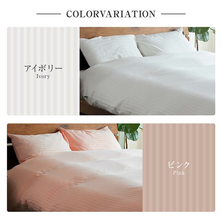サテン織りのなめらかな肌ざわりとソフトな光沢。ドレープ感のあるストライプが上質な眠りと安らぎを生みます。