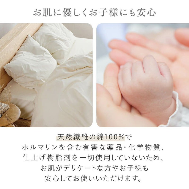 製品が出来上がるすべての工程において、環境や社会に配慮した方法が実行されている事の証しです。肌ざわりだけでなく、使う人の気持ちまで快適になるような寝具です。