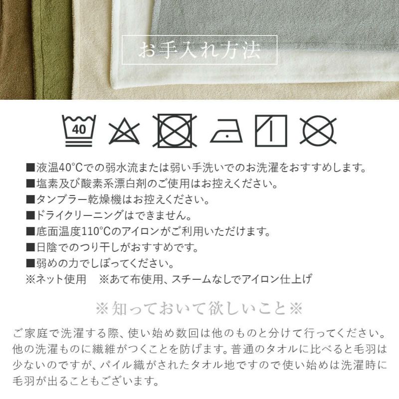 伸縮性に富み、パイルがひっかかりにくく、抜けにくいという特長を持っています。国内の工場で丁寧に仕上げました。柔らかなタオルの肌触りをお好みの方、汗かきの方にも大変お勧めの寝具です。寝室を彩るカラーバリエーションでご用意しました。
