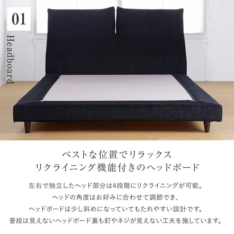 ファブリックの良さを最大限に追求した、国産最高級のファブリックベッドです。福井県越前市の協力工場で職人が1台1台手作業でお作りしている傑作品です。ヘッドボードは左右が独立しており、お好みの角度に調整していただけます。リクライニングは4段階。ベッドの上でテレビを見たり、読書をしたり、ゆったりくつろげます。脚と金具の取り付け位置で、ローベッド(マットハイ24cm)、ハイベッド(マットハイ14cm)に変更も可能。選べるカバーリングとお洒落なデザインで、快適なベッドライフをご提案いたします。