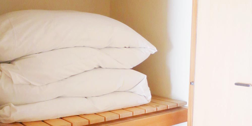 布団を収納するときは、しっかり乾燥させてから通気性のよい不織布の袋を活用しましょう。また、収納袋やケースに入れるときは、布団や服の上に防虫剤を置いて収納すると、ダニの繁殖を抑えやすくなります。