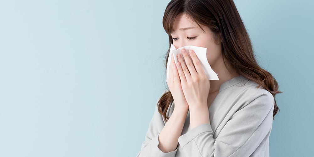 アレルギー鼻炎は、花粉やハウスダストなどの「アレルゲン」が鼻の粘膜に付くことで、くしゃみや鼻水などの症状が起こる病気です。主に、一年を通して発症する「通年性アレルギー性鼻炎」と、春や秋などの特定の季節に発症する「季節性アレルギー性鼻炎」の2種類がありますが、中には両方を合併している場合もあります。